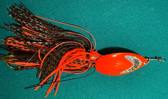 Sting has a #9 Fluted blade on the Bubba frame that provides great vibration and thump and is just a step down in size from Orcrist. This bait shines in high pressure situations and when the fish are more neutral. Sting sports a 63 strand musky cut skirt. The single #9 fluted blade is ideal for all day casting while fishing multiple areas and will not wear you out as much as other blades. Sting is an excellent choice when you want a fairly large profile, but not the fatigue associated with harder pulling blades. It is built on .051" wire shaft, with solid beads, extra strong split ring, one 63 strand cable tied 7" musky cut skirt, 5/0 treble hook.